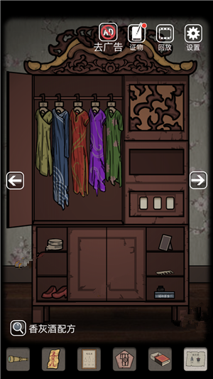 6、点击右边衣服柜子得到第3个配方。进入配酒场景,用符纸来烧灯烧,得到烧过符纸。进行配酒,回到一楼可获得三个图标。