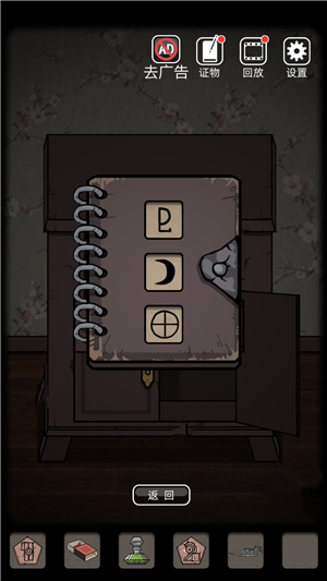 10、回到床,用钥匙点左边柜子,获得发箍、备忘录(符号)、镶嵌物1。