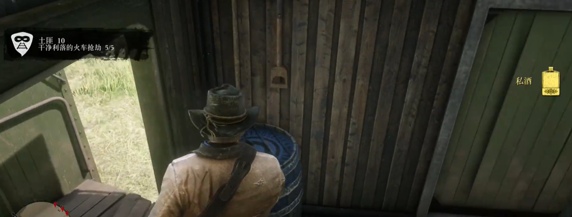 6、最后一次我们去下一节车厢里拿去门口蓝色木桶上的私酒,即可完成土匪挑战10。