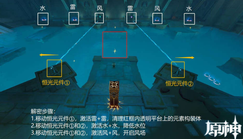 10、移动恒光元件①,激活雷+雷,清理红框内透明平台上的元能构装体,获得宝箱三。