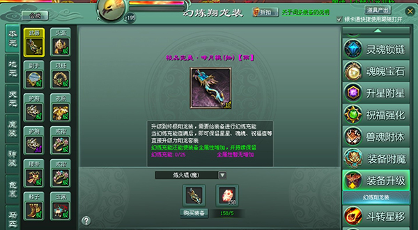 2、装备升级:需100两军票,使用幻炼石和精致升级宝石,每件装备成功升级可获翔龙礼包,含四等光暗魂魄石、工资及天元精魄。