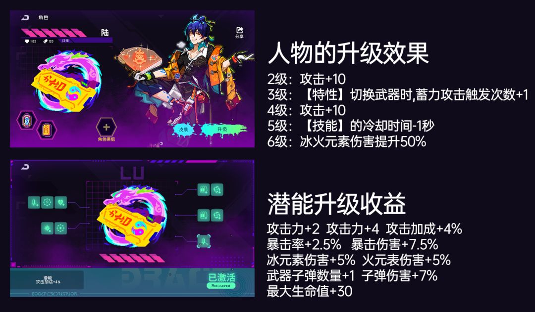 首先介绍下陆的升级效果,比较关键的就是一些属性伤害的加成,还有对陆技能带来的收益,切换武器时候蓄力攻击多触发一次,技能冷却时间减少一秒,至于潜能建议全部升级就行!