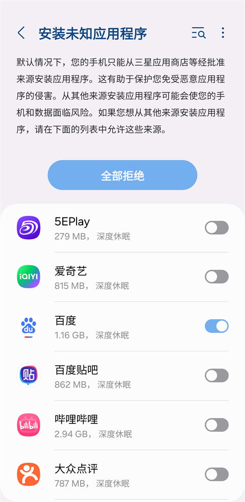 1、在三星手机上使用百度APP安装软件或游戏时,需先勾选“总是允许安装此来源的未知应用程序”。