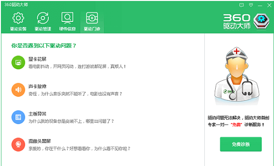 4、打开360驱动大师软件,点击顶部的“免费门诊”,可以对“显卡花屏”、“声卡故障”、“主办异常”、“摄像头黑屏”等等问题进行处理,还有专家一对一的免费诊断服务哦!点击“免费诊断”即可。
